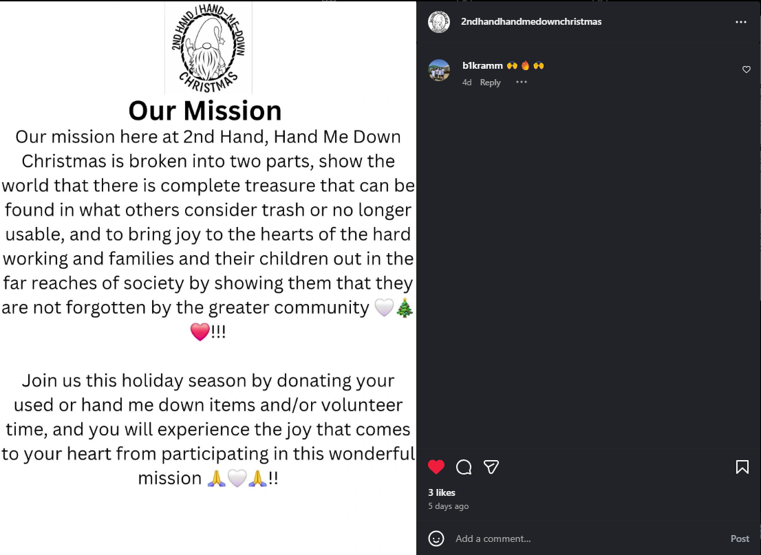 2nd-Hand / Hand-Me-Down Christmas is a community-driven program based in Conejos County, Colorado, dedicated to helping individuals and families in need throughout the San Luis Valley. Our mission is to collect gently used items and redistribute them to community members of all ages — from newborns to elders.